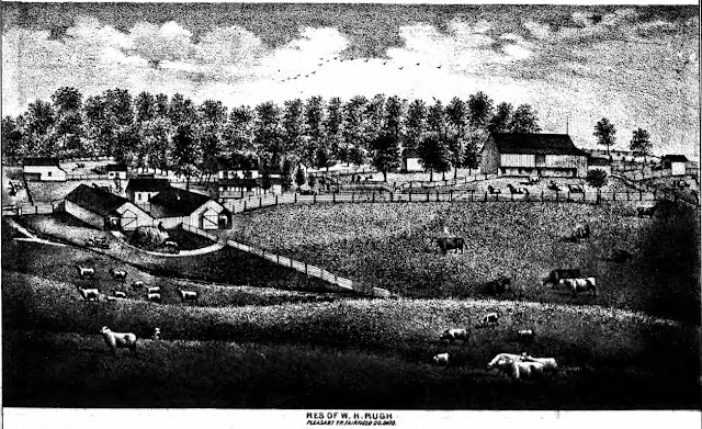 By 1860 Christopher Rugh owned his complete farm. It was valued at $11,520 and totaled 288A at the time and was still listed as a 288A plot on the 1866 map in section 23 of Pleasant Township. At the time of his death in 1873 it was 270A. He had lost the 13A top right corner to John Martz.